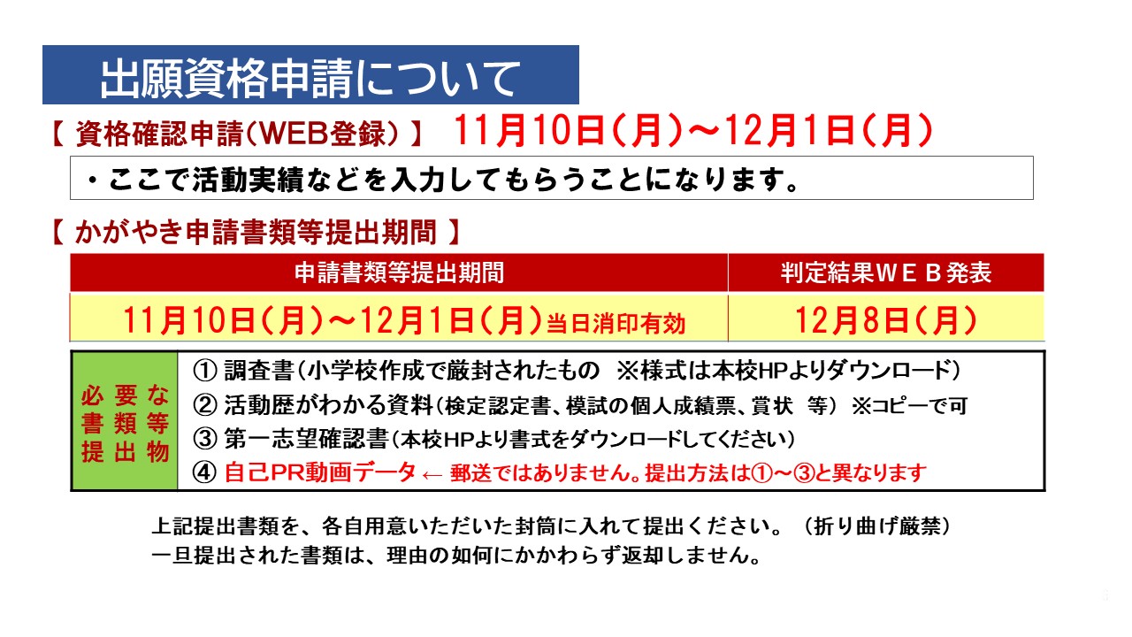 | 対象 | かがやき入試説明会(動画配信)をご視聴いただき、かがやき入試の出願資格確認にエントリーできる方 |